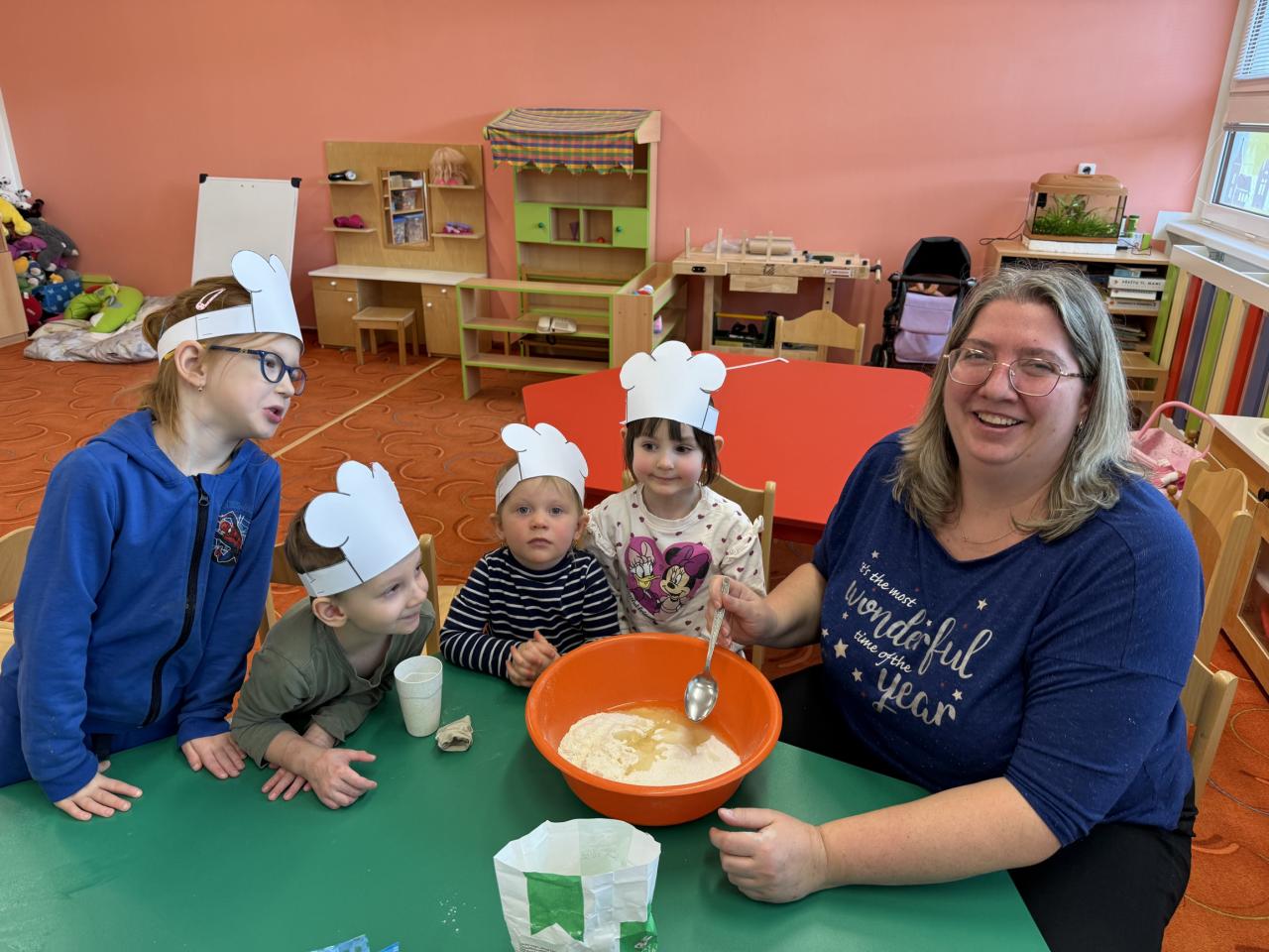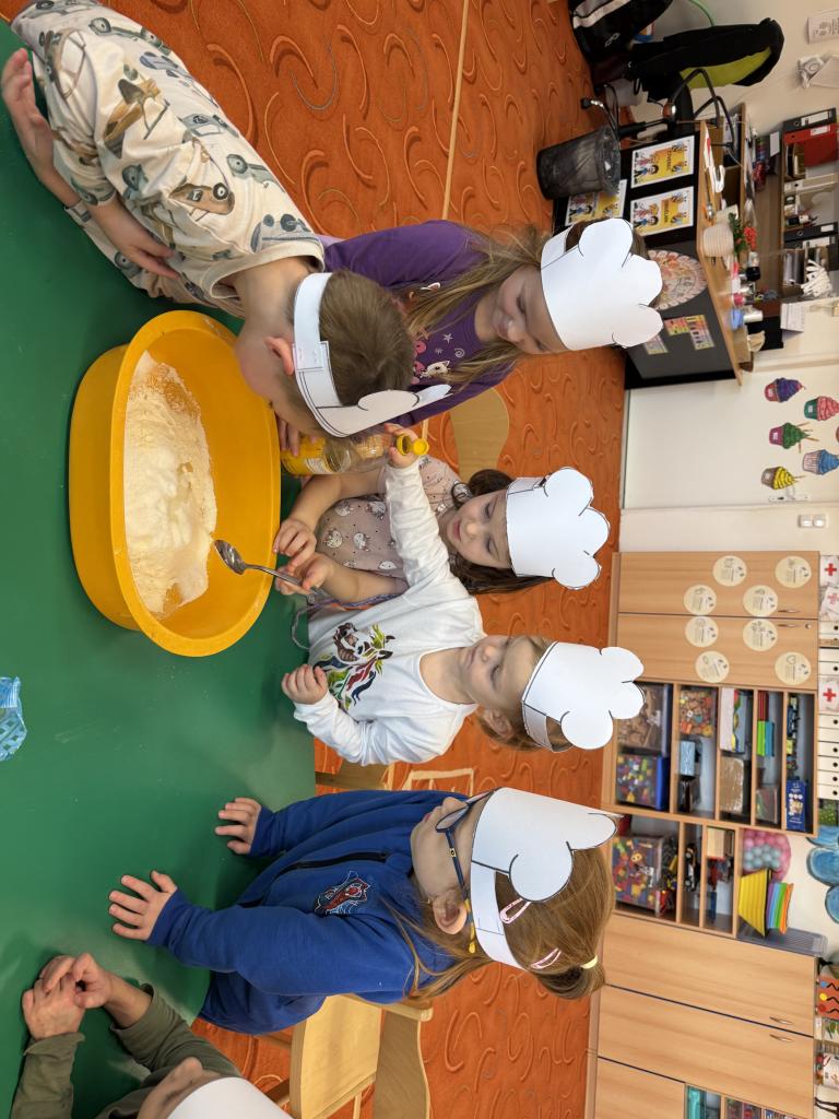 Nezůstalo ale jen u modelování. Vyzkoušeli jsme si také skutečné pečení. Společně jsme připravili perníkovou buchtu. Děti postupně přidávaly suroviny, míchaly těsto a s napětím sledovaly, jak se buchta peče v troubě. Vůně perníku provoněla celou třídu a radost z vlastnoručně připravené dobroty byla o to větší. Děti si tak mohly samy potvrdit, že bez práce by si na sladké pochoutce opravdu nepochutnaly.