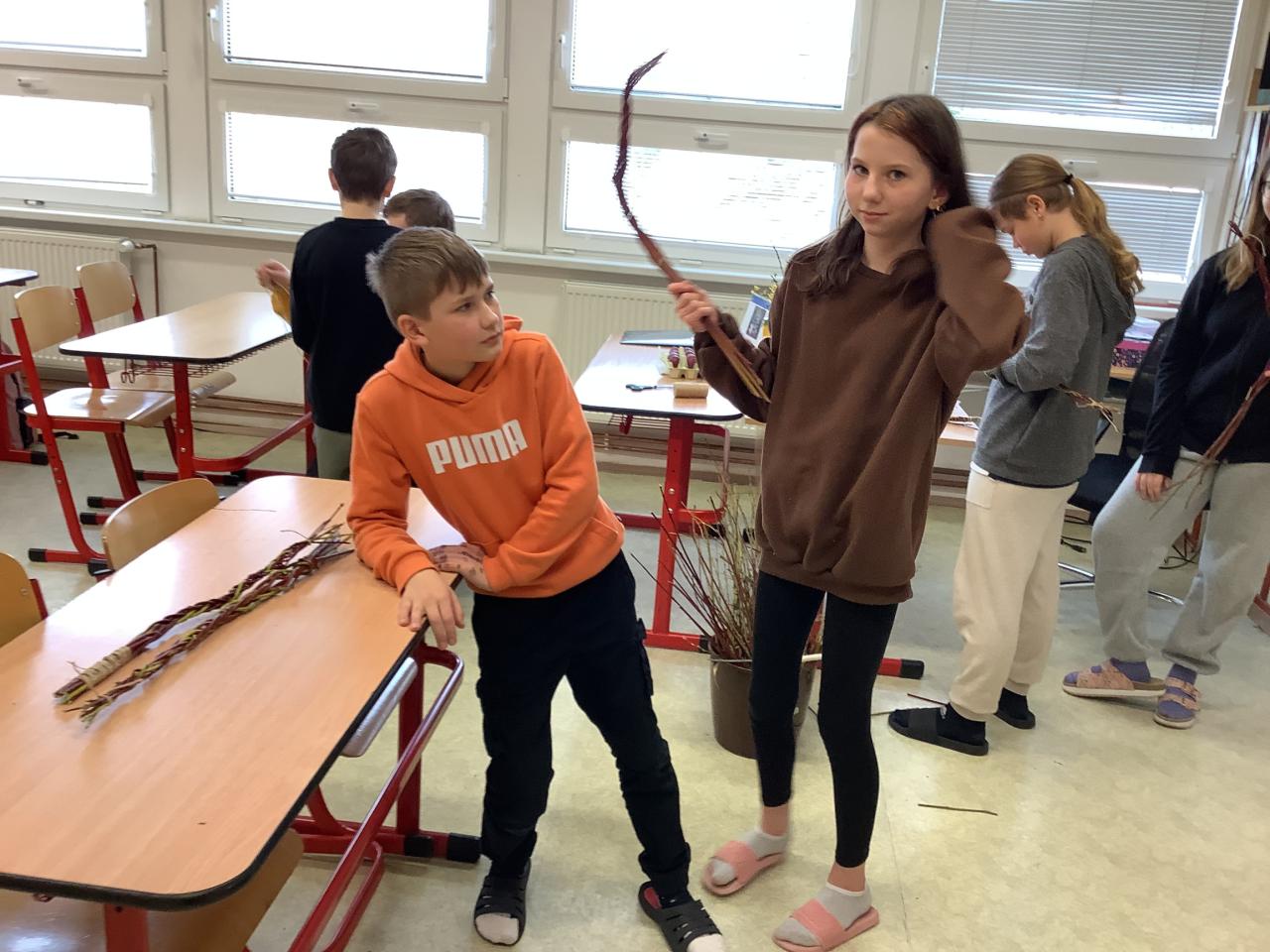 V České republice a na Slovensku je běžnou tradicí pomlázka a pomlázkování. Muži pomlázejí ženy a dívky, aby je ochránili před nemocemi a přinášeli jim štěstí a zdraví na celý rok. Se šesťáky jsme zkusili pomlázku uplést. Žáci i žákyně se do pletení proutí pustili s vervou. Zjistili, že to není tak jednoduchá práce, která by byla hned hotová. Někomu se dařilo více, někomu zase méně. Rozhodně si ale všichni prověřili svoji trpělivost a odhodlání.