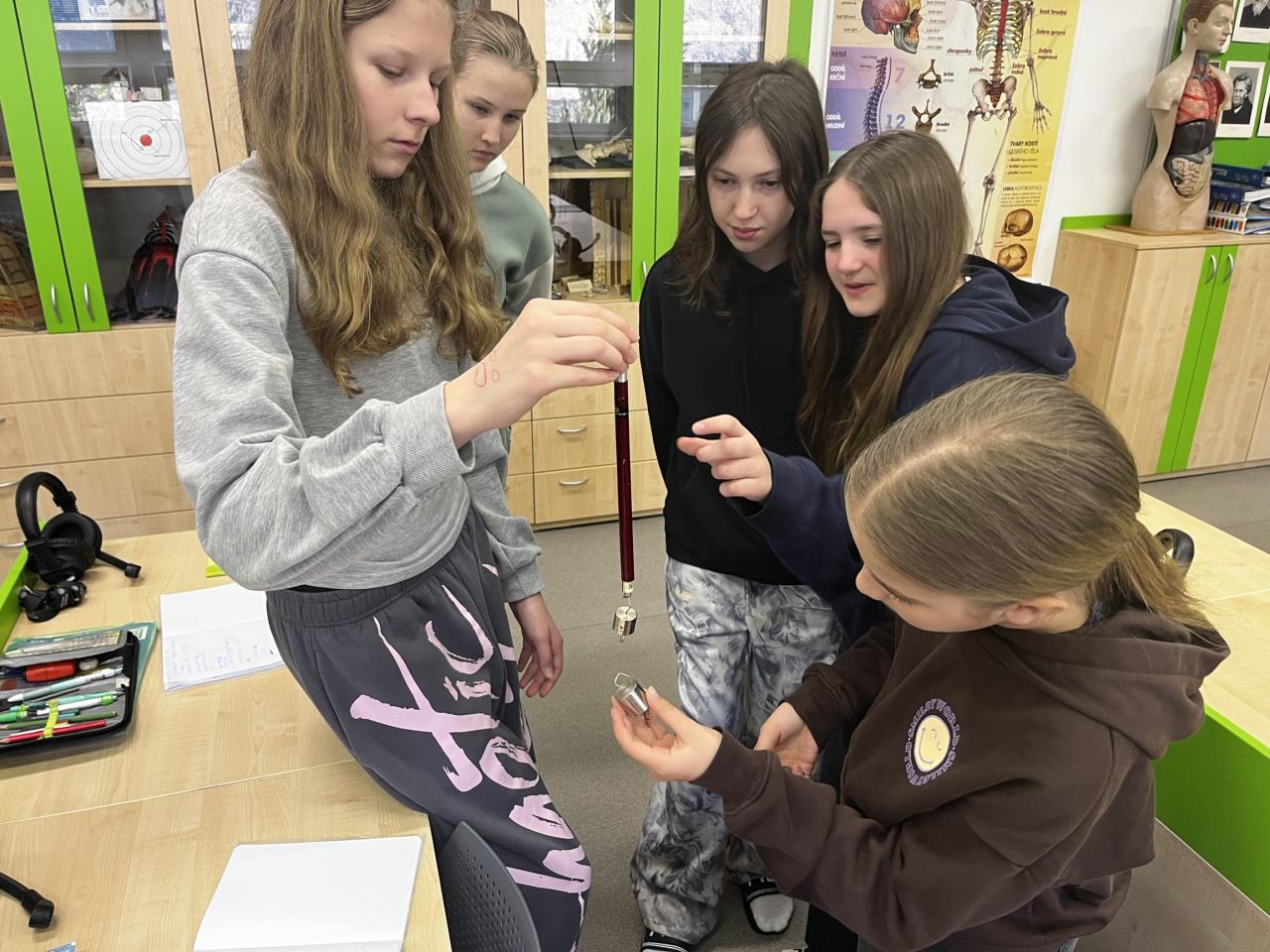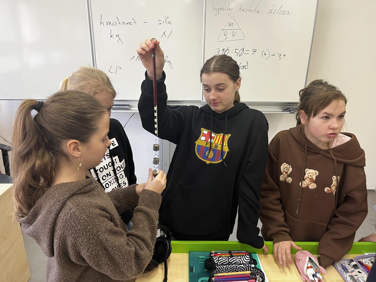 Žáci 6. ročníku si v hodině fyziky prakticky vyzkoušeli měření síly pomocí siloměru. Během experimentů sledovali, jak se velikost síly mění při přidávání závaží, a ověřovali tak její závislost na zatížení.