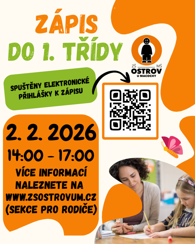 Zápis k povinné školní docházce pro školní rok 2026/2027 proběhne dne 2. 2. 2026 od 14 do 17 hod. v budově školy v prostorách prvního stupně.